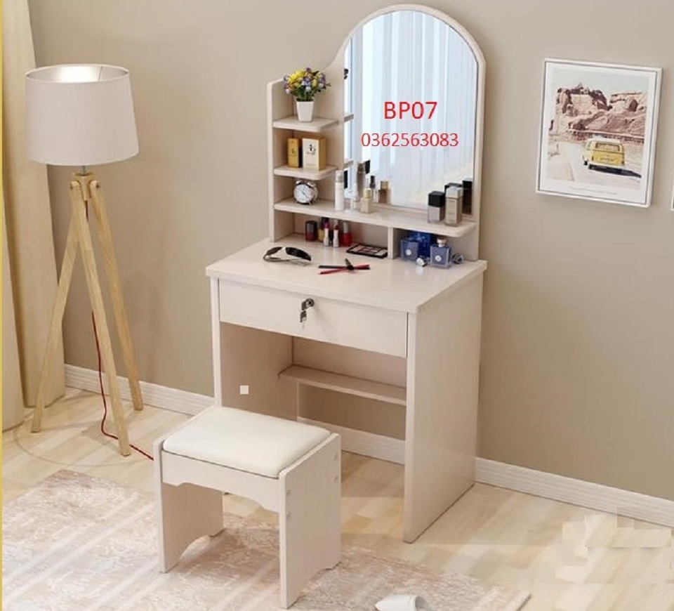Bộ bàn phấn Đẹp, Bàn phấn hiện đại, cho phòng ngủ BP07 được thiết kế với kiểu dáng đơn giản, nhưng cũng không kém phần sang trọng. Bàn thiết kế kệ liền gương tiện lợi, tiết kiệm không gian, kệ có nhiều ngăn để bạn có thể để mĩ phẩm, nước hoa.
