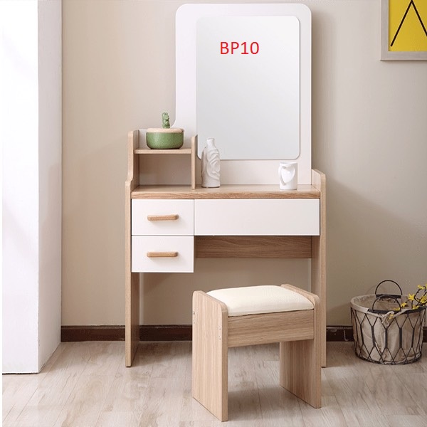 Bộ bàn phấn Đẹp, Bàn phấn hiện đại, cho phòng ngủ BP10 được thiết kế với kiểu dáng đơn giản, nhưng cũng không kém phần sang trọng. Bàn thiết kế kệ liền gương tiện lợi, tiết kiệm không gian, kệ có nhiều ngăn để bạn có thể để mĩ phẩm, nước hoa.