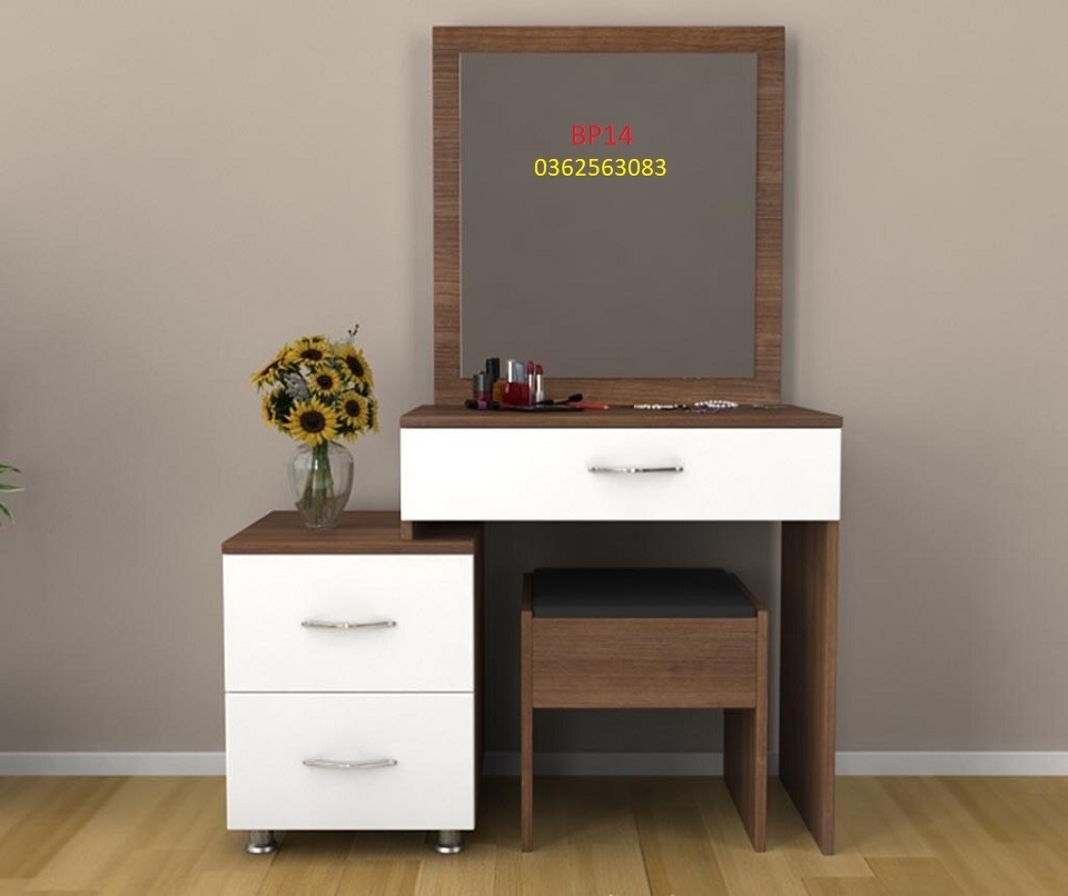 Bộ bàn phấn Đẹp, Bàn phấn hiện đại, cho phòng ngủ BP14 được thiết kế với kiểu dáng đơn giản, nhưng cũng không kém phần sang trọng. Bàn thiết kế kệ liền gương tiện lợi, tiết kiệm không gian, kệ có nhiều ngăn để bạn có thể để mĩ phẩm, nước hoa.